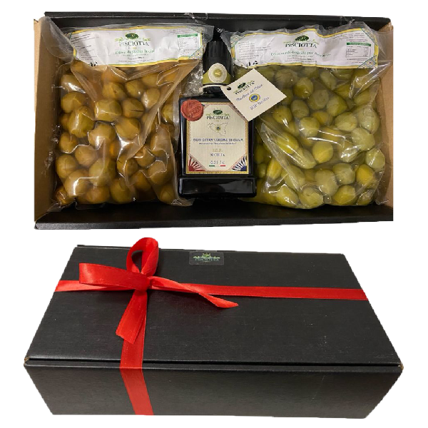 Un’elegante box regalo che racchiude due buste di pregiate olive da 500 g e una bottiglia di olio extravergine d’oliva da 250 ml, espressione di qualità, tradizione e gusto autentico.